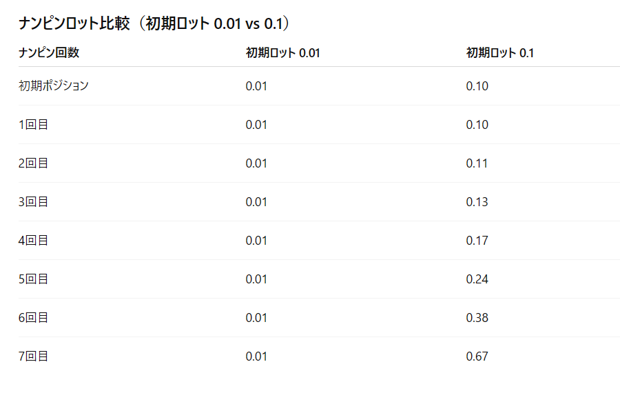 初期ロットが小さい場合(例:0.01ロット)は、ナンピンしてもほとんど同じロットになることがあります。