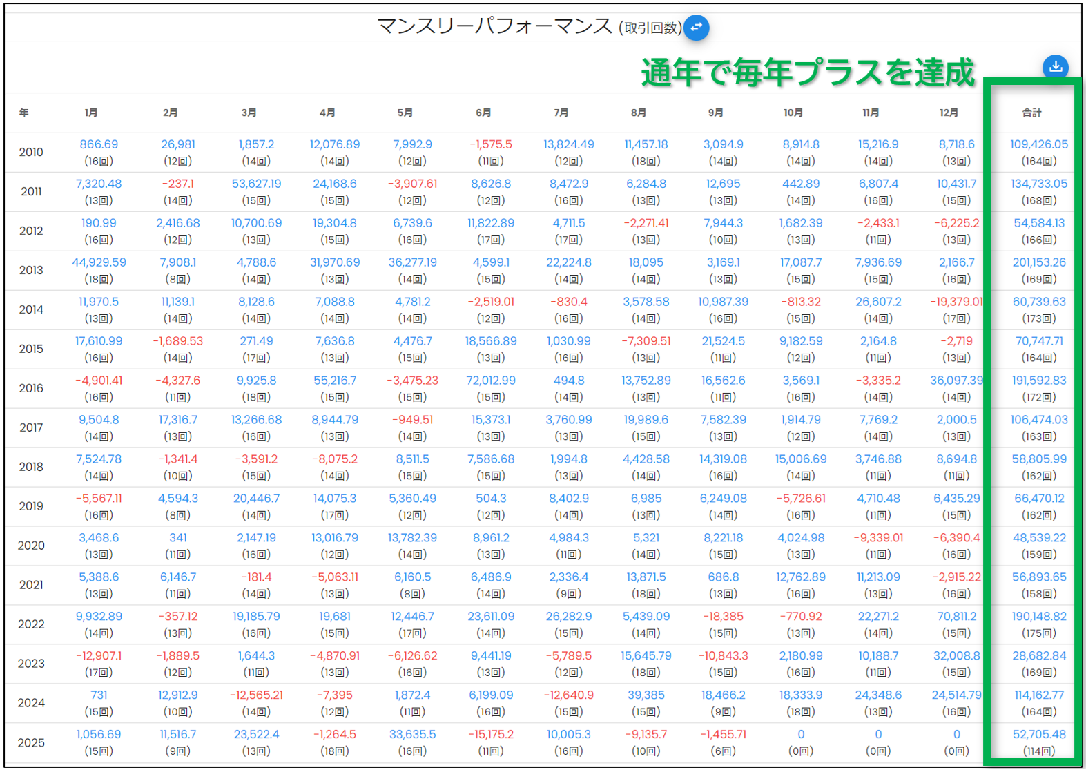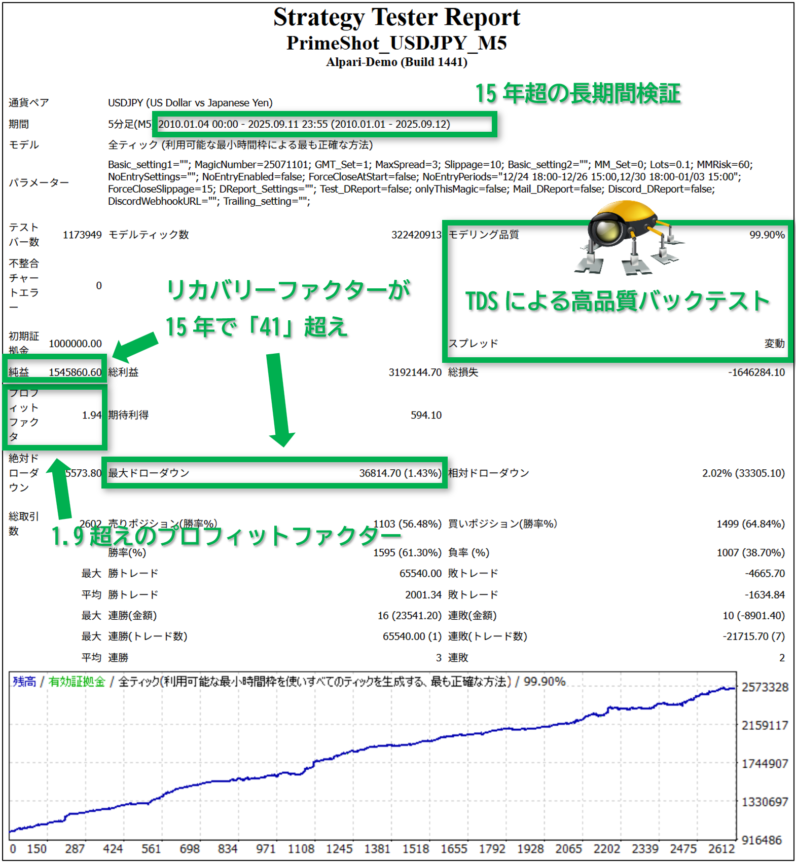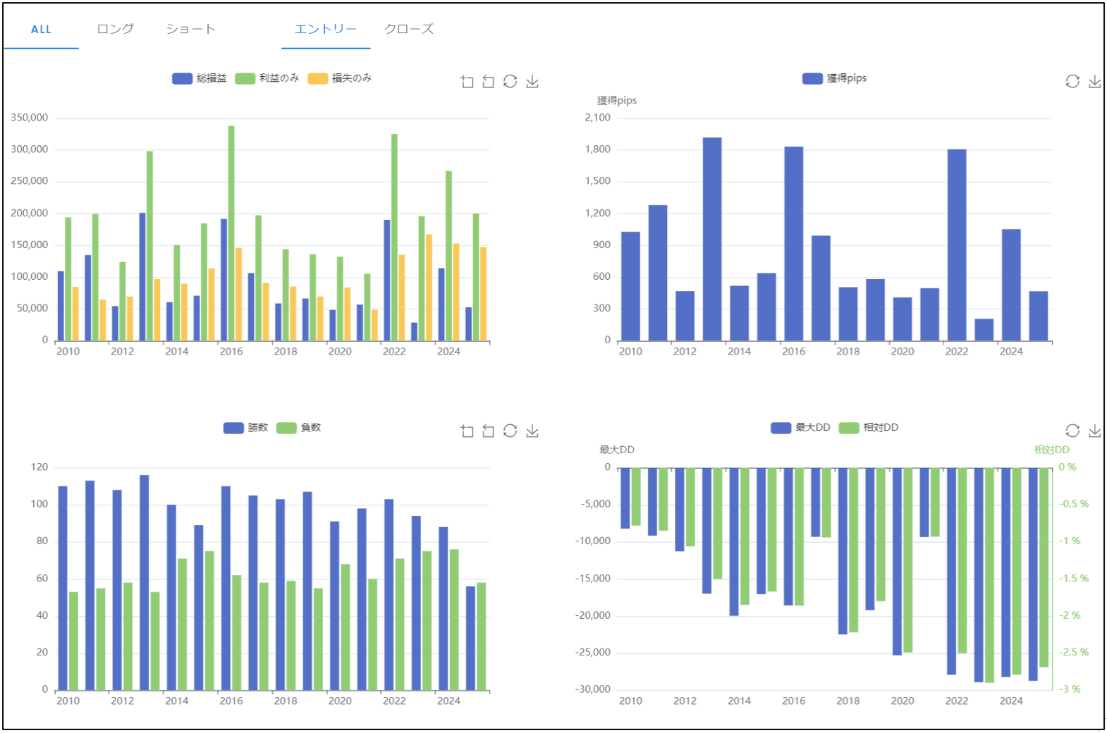 通常、リカバリーファクター(計算方法は「純益÷最大ドローダウン」)は10年バックテストなら「10」を達成すれば優秀と言われる指標。本EAは2010年から2025年までの約15年間のバックテストで、脅威のリカバリーファクター「41」超えを達成しています。