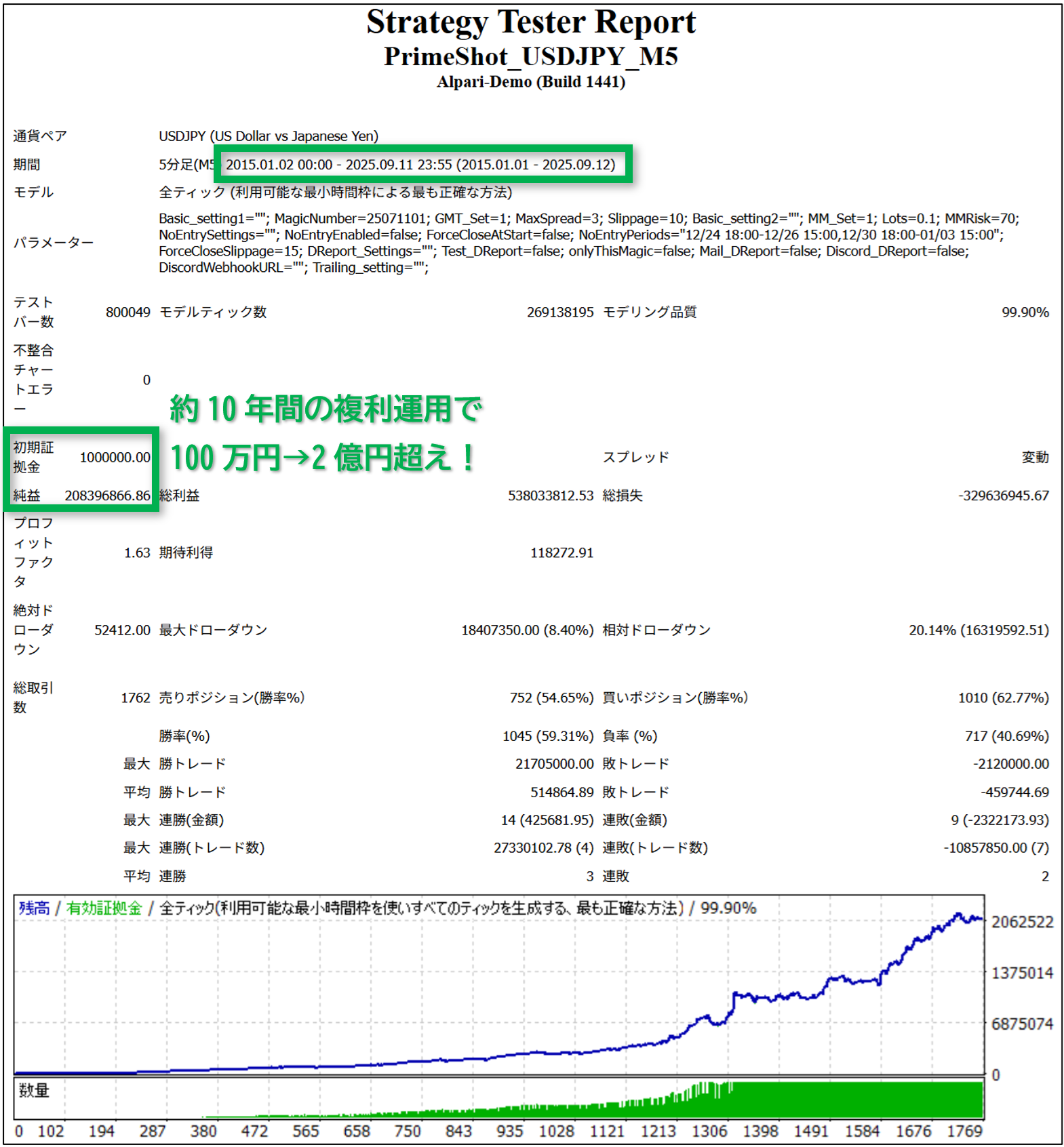 10.7年の運用で、リスク割合70設定の場合、初期証拠金100万円→2億円超えの利益達成を記録。