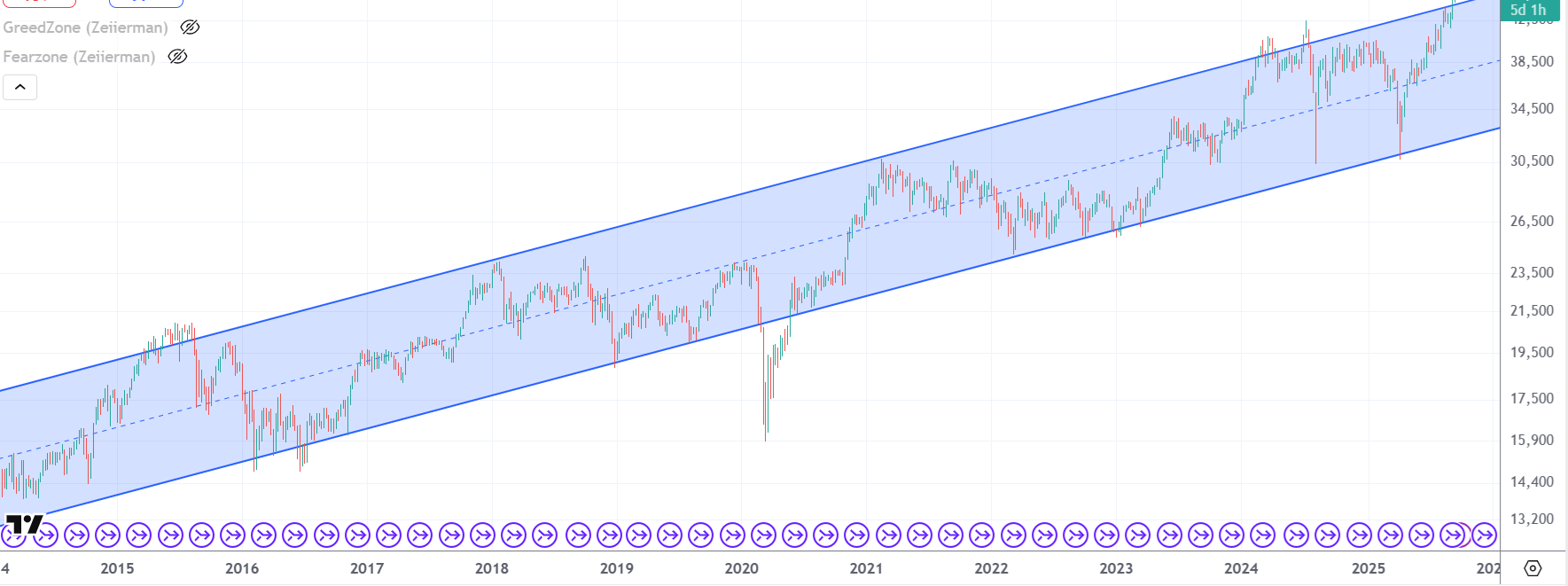 参考として、長期のチャートを対数(Log)ベースにして表示させると、大体割安、割高を判断しやすくなります。