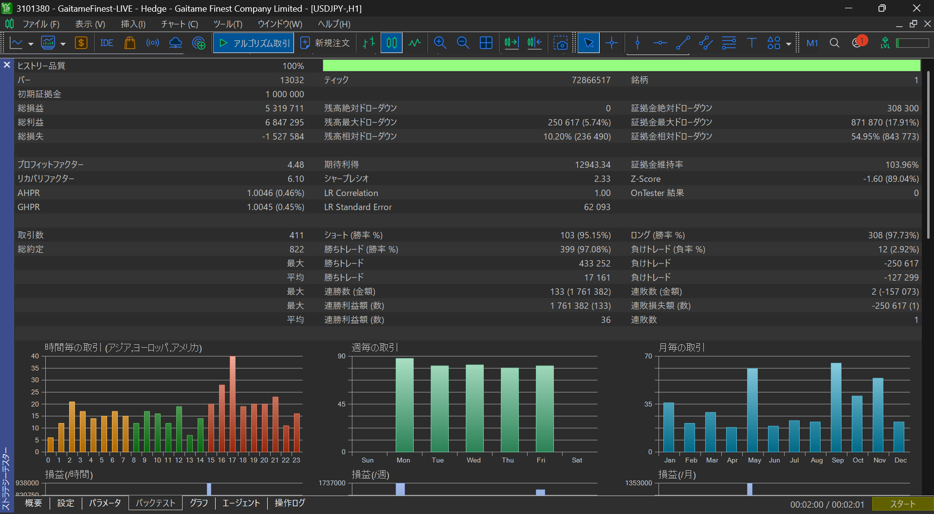 優れたリスク回復力(リカバリーファクター 6.10): 最大ドローダウン(一時的な最大損失)から利益を回復する力が非常に強いことを示しています。
