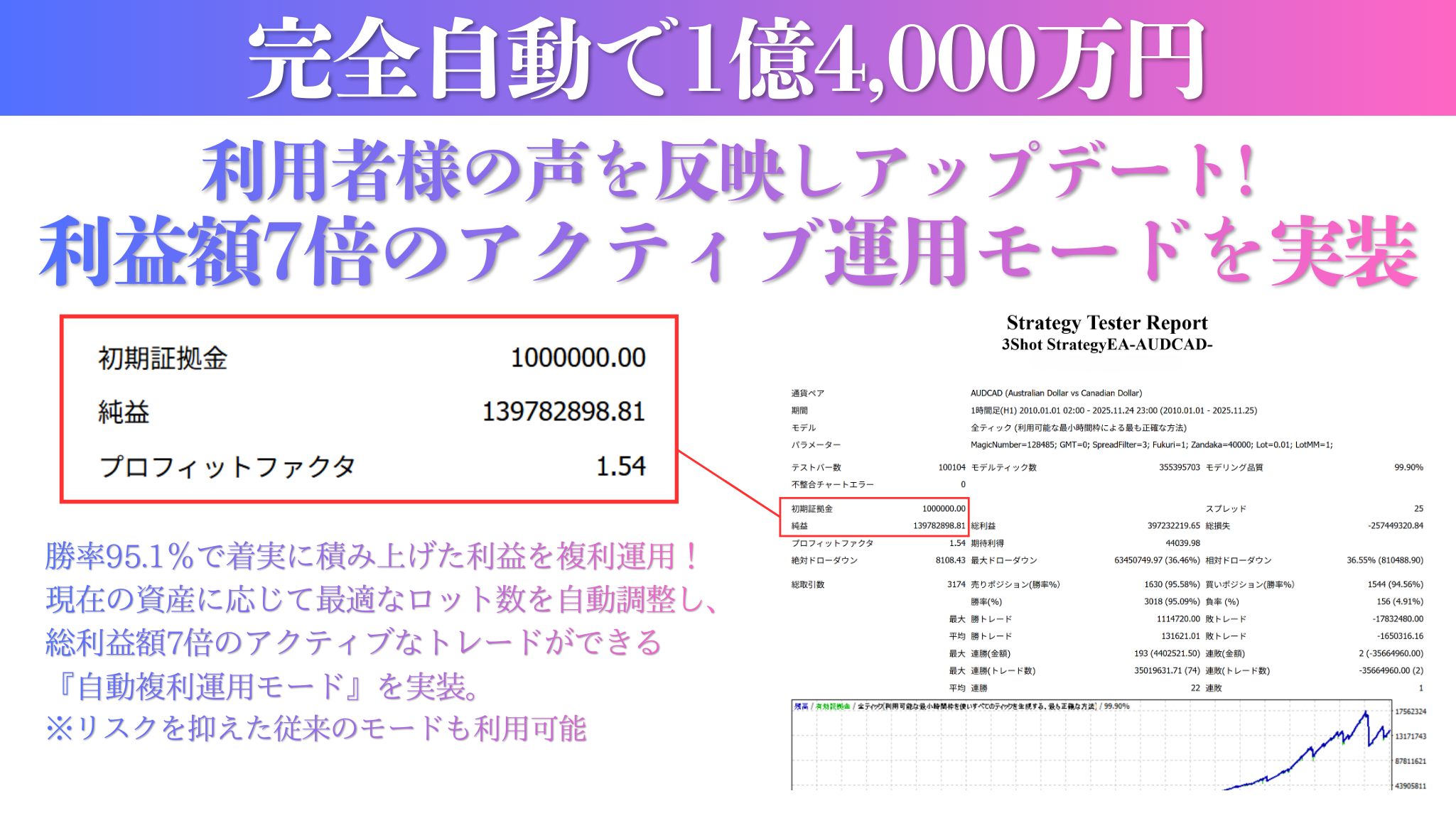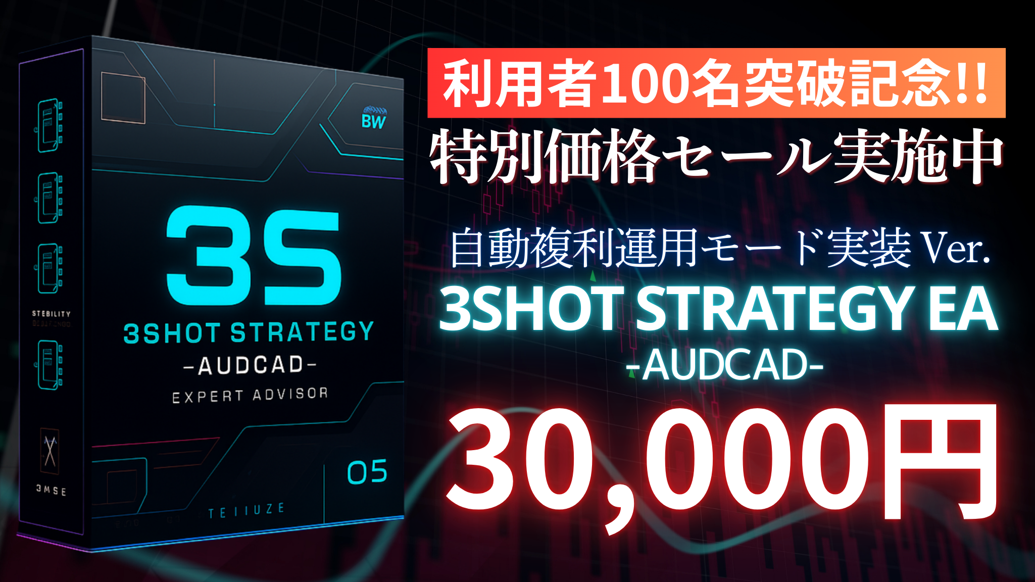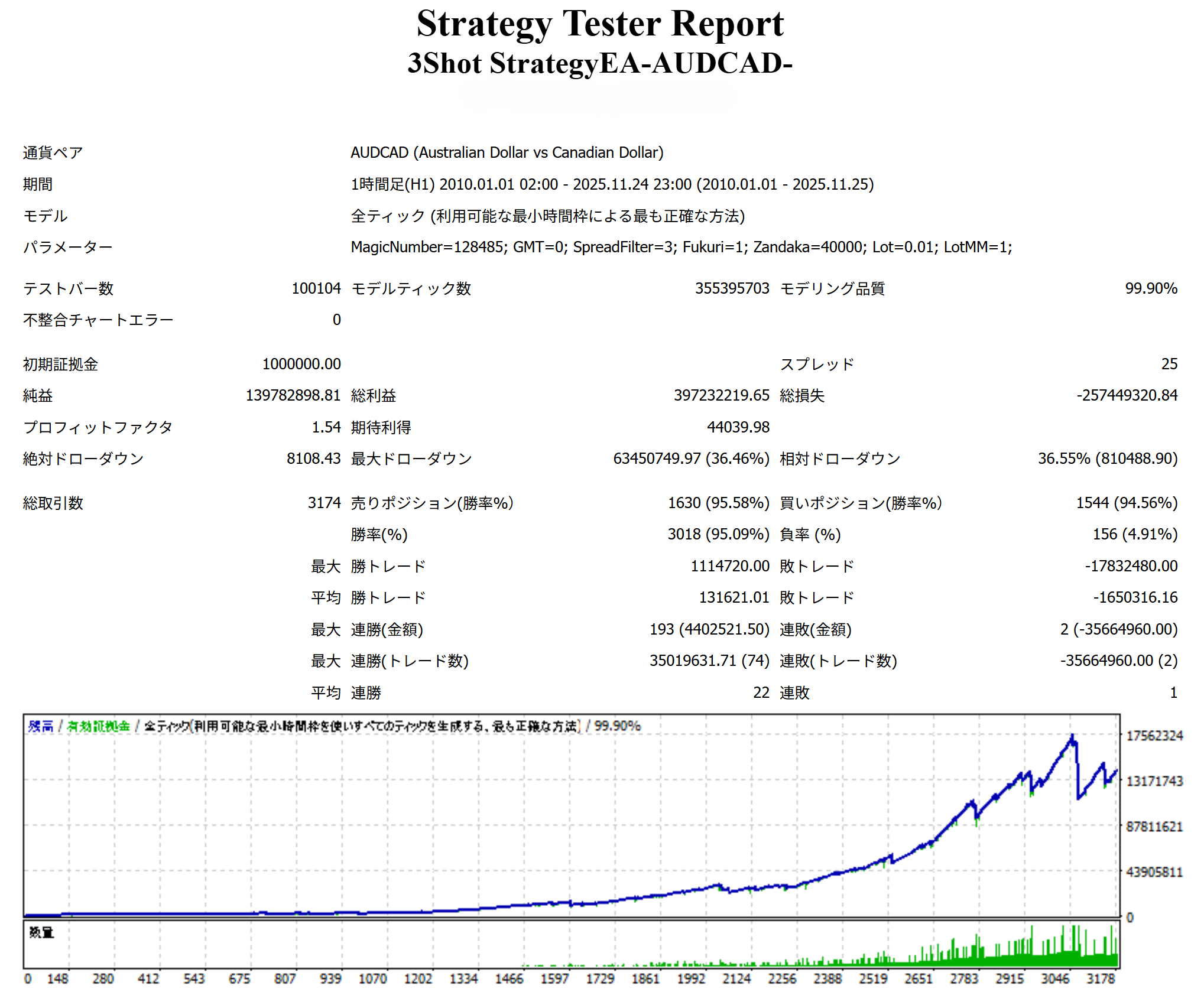 これまでEAを運用したことがあるトレーダーなら、 ・最初は勝てても、負けが続けば「このEAはダメだ」と感じてストップ。 ・一度は資金が増えても、その後の連敗で削られてしまう。 ・あるいはナンピンを繰り返した末に、資金を一瞬で飛ばしてしまった…。 こんな経験をしたことがあるかもしれません。 もちろんロジックや性能も原因のひとつですが、 本当の理由は「EAを継続できないこと」。 事実としてEAで稼ぎ続ける未来を手放しているのは 最終的には「自分自身の判断」なのです。 しかし、すべてを任せる完全自動のEAであれば 負けが続けば止めたくなるのも当然。 性能の悪いEAであれば早い決断はむしろ正解です。 そしてここまでの内容を踏まえ、 あなたにお聞きしたいことがあります。 「継続し続けたくなるEAに出会ったことはありますか?」 答えがNoであれば、 ぜひ「3Shot Strategy EA-AUDCAD-」の性能をご覧ください。 これまでのEAとは一線を画し 「止めたくなることがない」「継続できる」ことを前提に設計された、 全トレーダー待望のEAであることを実感いただけるはずです。