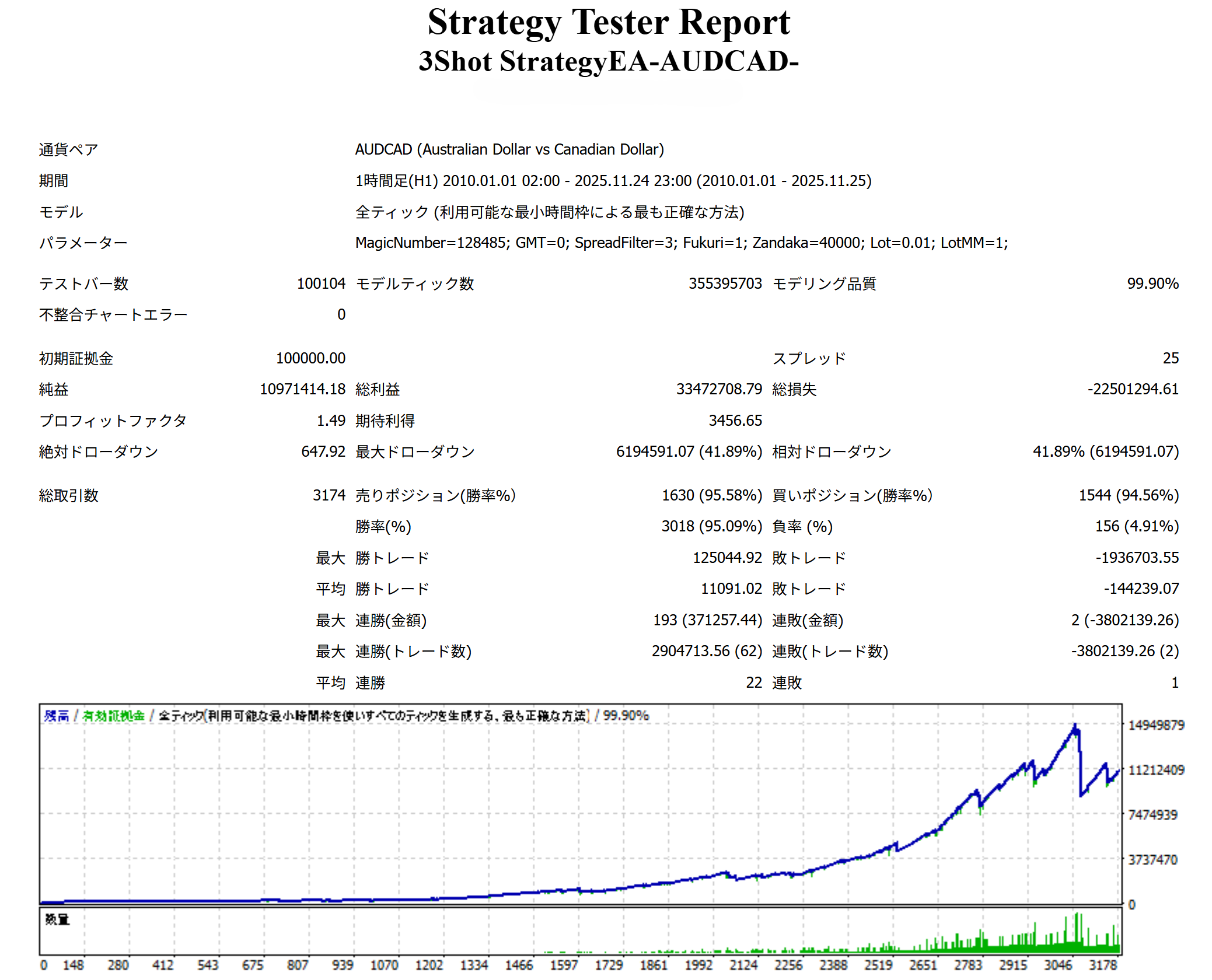 しかしAUDCADは主要通貨であり流動性が高いため、実運用でもバックテストに近いパフォーマンス を期待できます。