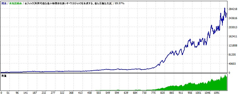 ロット上げが容易になれば、自動ロットの収益曲線の通り利益が膨らむスピードが速くなる期待が大きくなります。このEAの優れている点です。