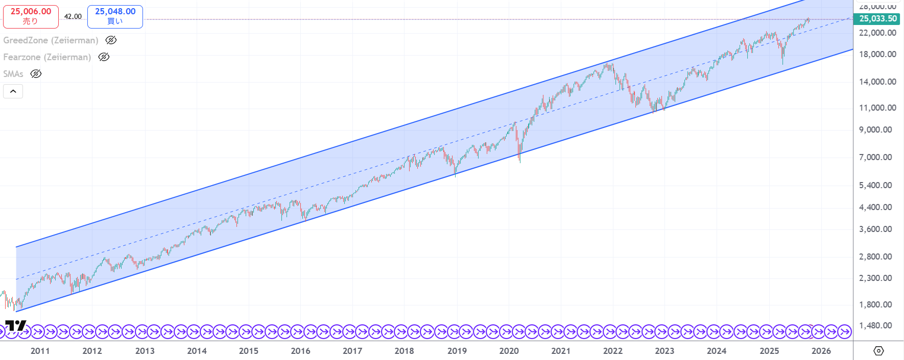 参考として、長期のチャートを対数(Log)ベースにして表示させると、大体割安、割高を判断しやすくなります。