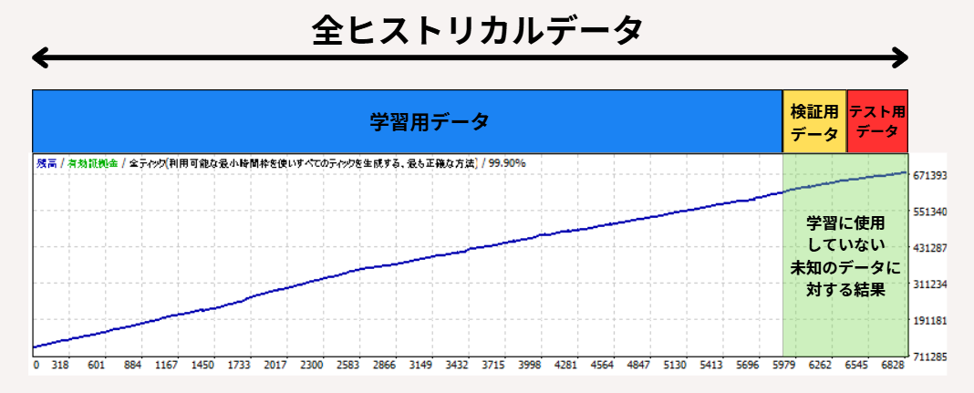 本EAではさらに検証用データとテスト用データの2つに分けて、2段階のテストを実施しています。