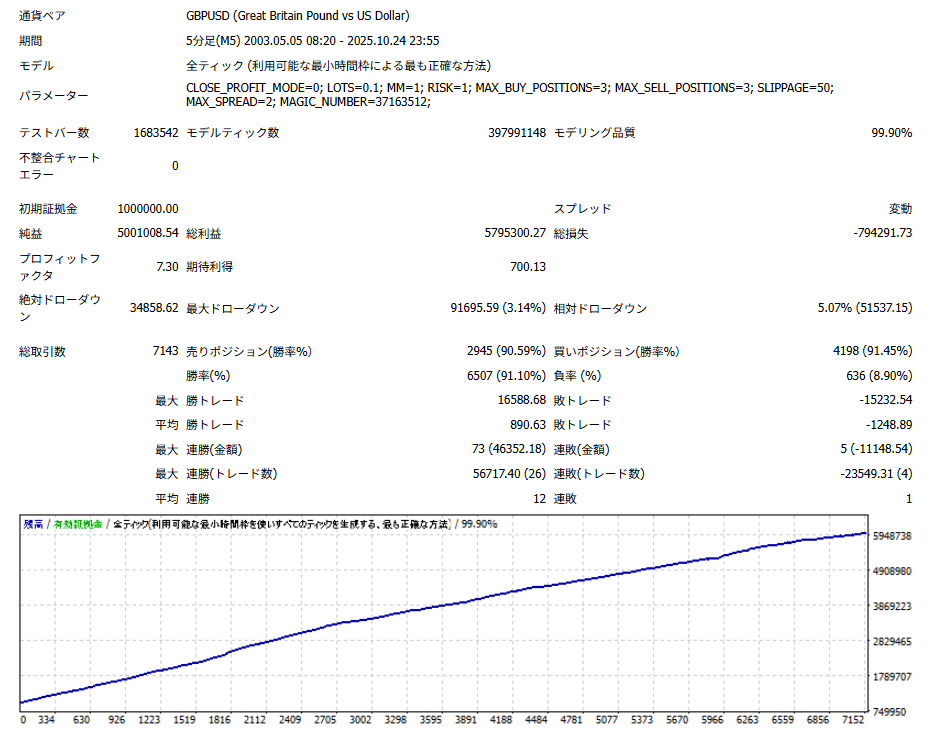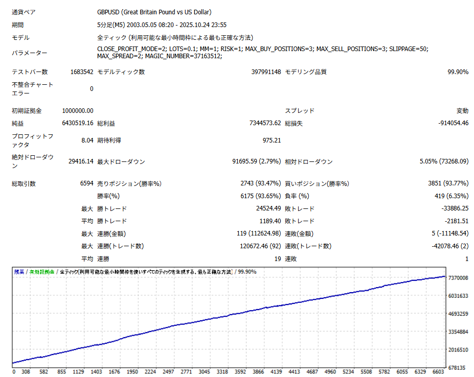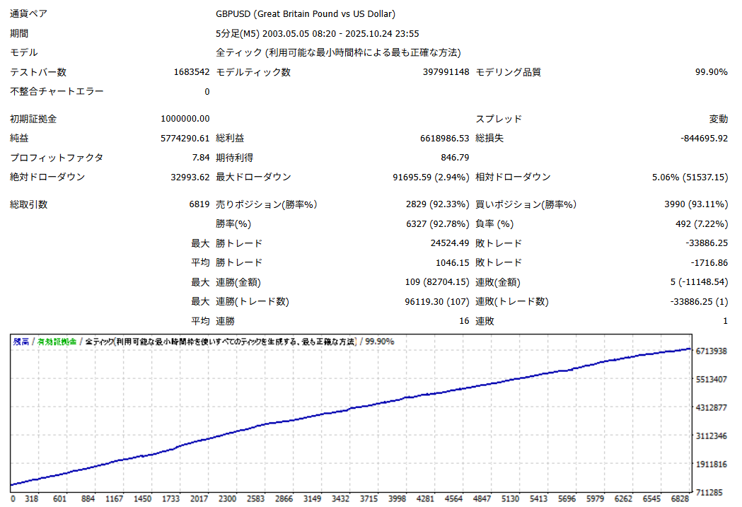 PFは7.84、勝率は92.78%、取引回数は6819回と、AIによる学習だからこそ実現できる数値を誇っています。