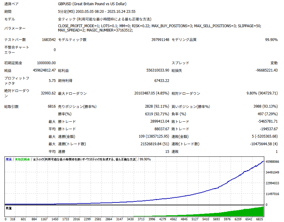 22年間のバックテストの結果100万円から4億5900万円まで資金を伸ばすことができています。