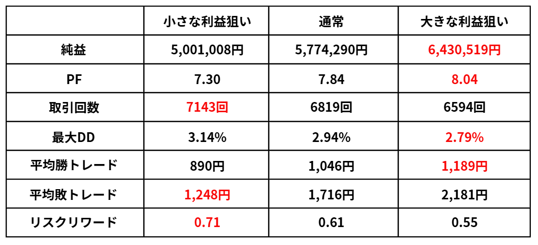 利益がでるまで待つため取引回数が減り最大DDも大きくなりやすいですが、より大きな利益を狙うことができます。