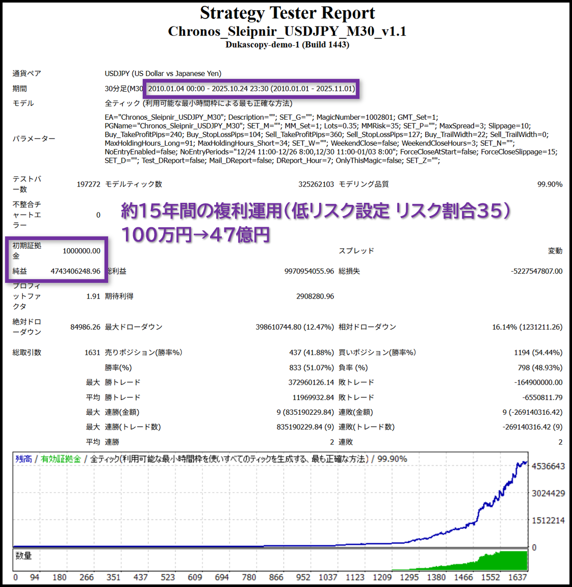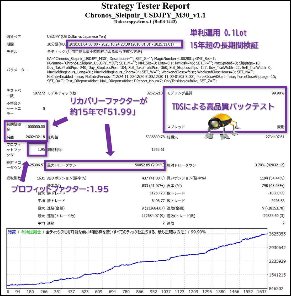 本EAは2010年から2025年までの約15年10ヶ月間のバックテストで、驚異のリカバリーファクター「51.99」を達成しています。