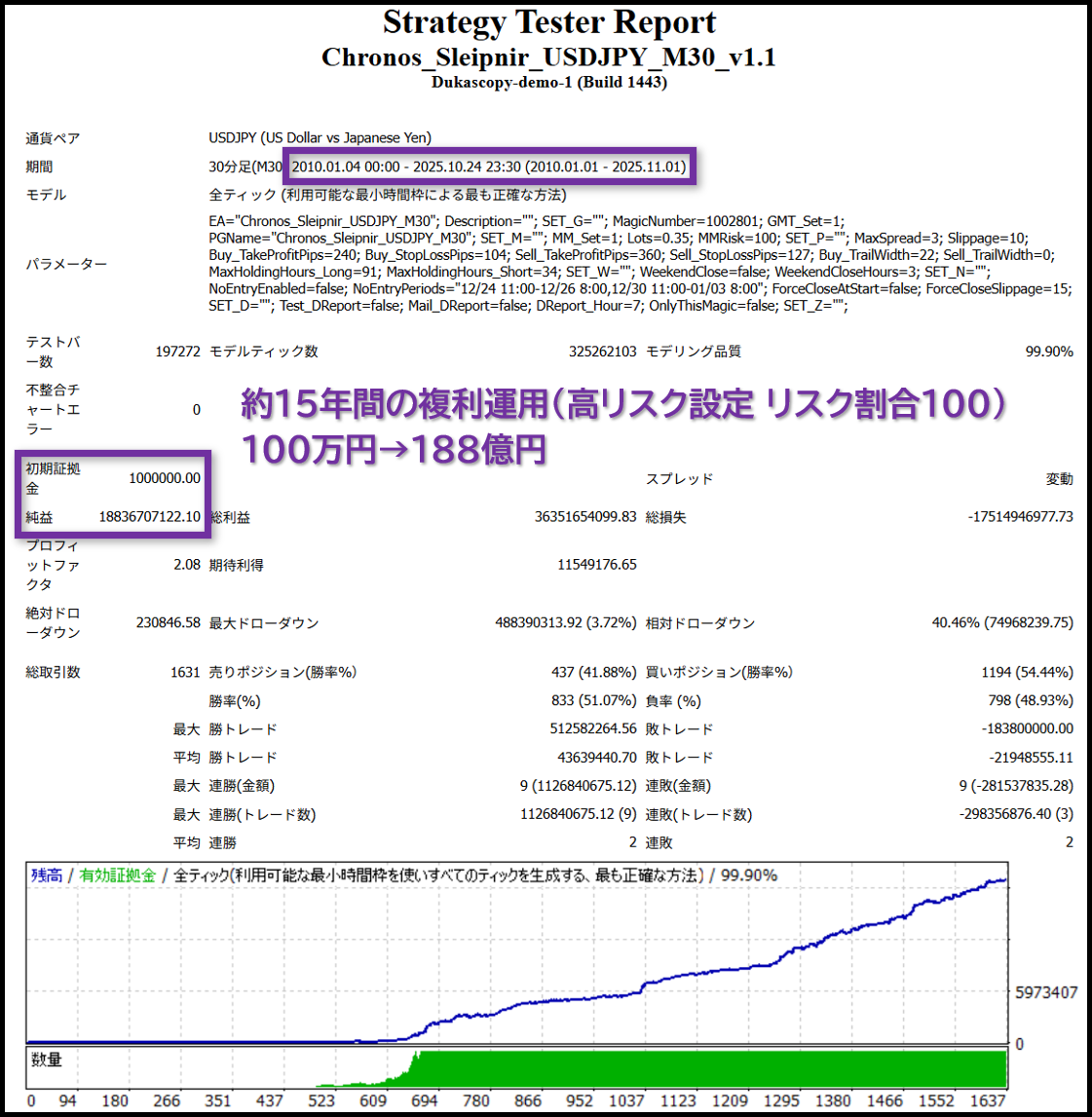 15年10ヶ月のバックテストで、高リスク設定(一例としてリスク割合設定:100)の複利運用の場合