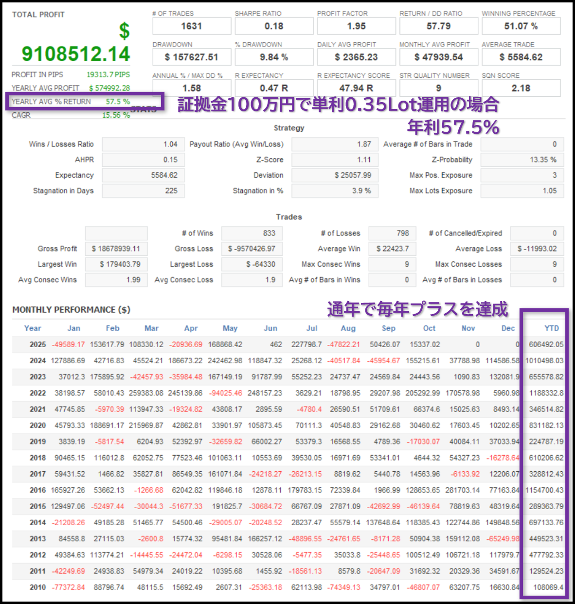さらに、プロフィットファクター「1.95」を記録し、長期的な統計優位性を徹底的に追求した結果、極めて安定した収益性を実現しました。