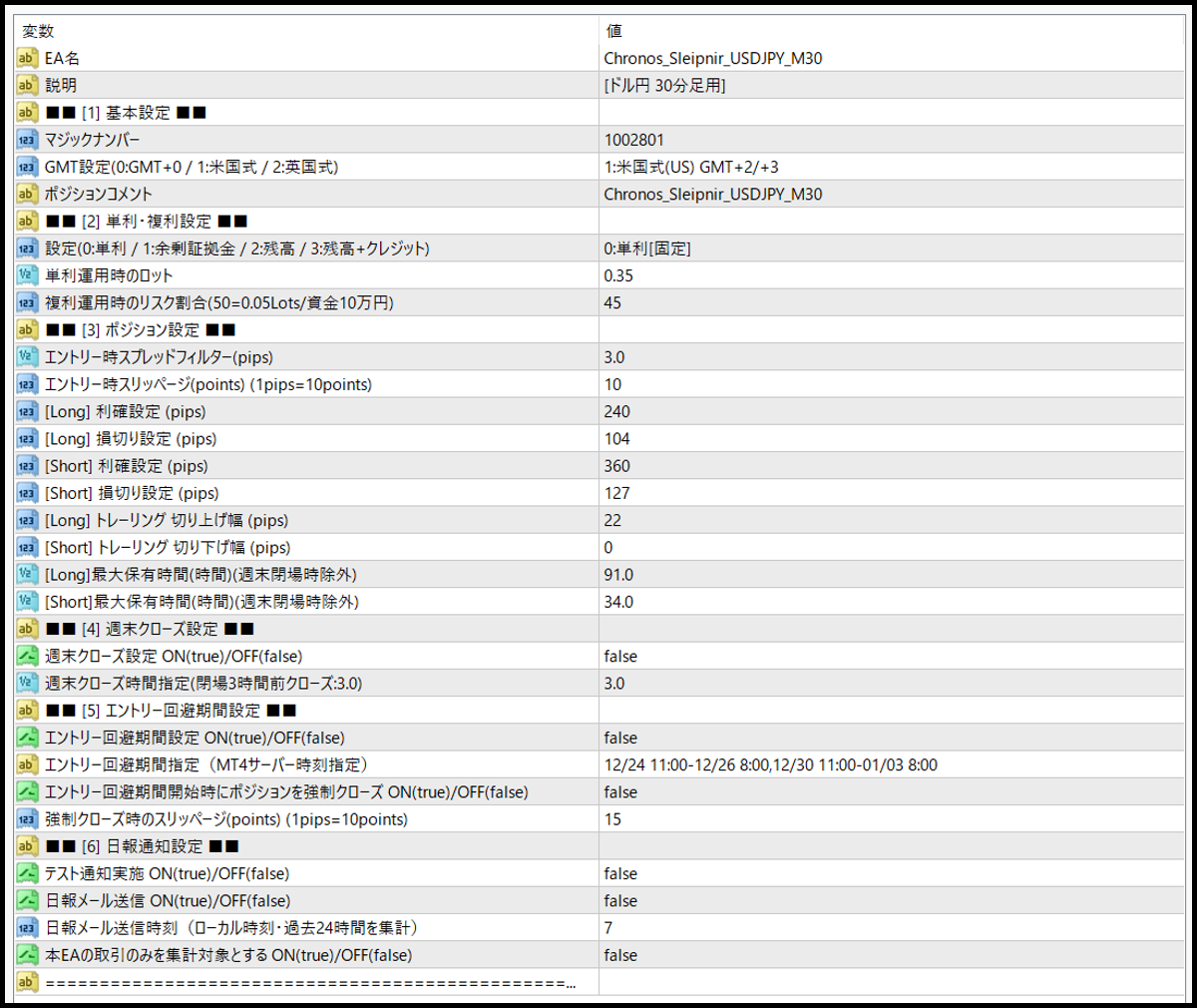 これらにより、損小利大を可能な限り追求できるよう調整し、USDJPY 30分足に特化して、15年超の長期バックテストで安定した成績のEAを実現しました。