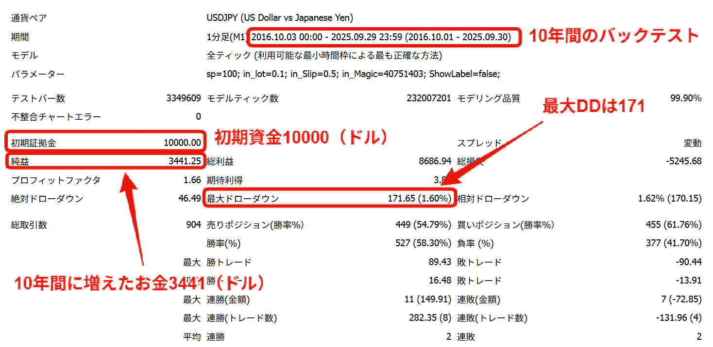 実はあまり重要ではないと思れるのがPFです。総利益÷総損失で求められ、1より多ければその戦略はプラス収支となります。分かりやすさがメリットで、注目されやすいです。 このEAの1.68という数字は良い方だと思います。 PFはむしろ、数字が良すぎる戦略は避けるためにあります。基本的には数字が大きい方が良いのですが、たとえばPF10みたいな良すぎる数字の場合、負けるときの金額が少なすぎるため不自然です。過剰最適化(カーブフィッティング)されているか、ナンピンで損切りを無理矢理回避しているんじゃないかと警戒します。②取引回数は10年間で904回
