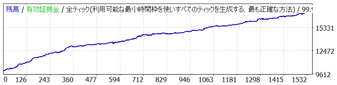 つまり、初期資金10000(ドル)に対して、最大ドローダウン(もっとも資金が凹んだ谷の深さ)が1517(ドル)なので、10年間の最大ドローダウンは約15%になるロット設定で運用テストをしたところ、31756(ドル)を得ています。