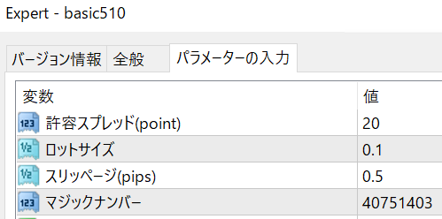 勝率も分かりやすいので注目されやすいですが、高ければ良い、低ければ悪いという単純なものではありません。利益率との兼ね合いで判断するものです。 ただ、同じ利益率なら、勝率が高い方が統計的に成績は安定しますし、運用していて誰もが勝ちトレードの方が楽しいので、自然な範囲で勝率が高いのは良いことです。 このEAの58%の勝率は、まさに理想的な勝率の高さです。basic510の設定はこれだけ