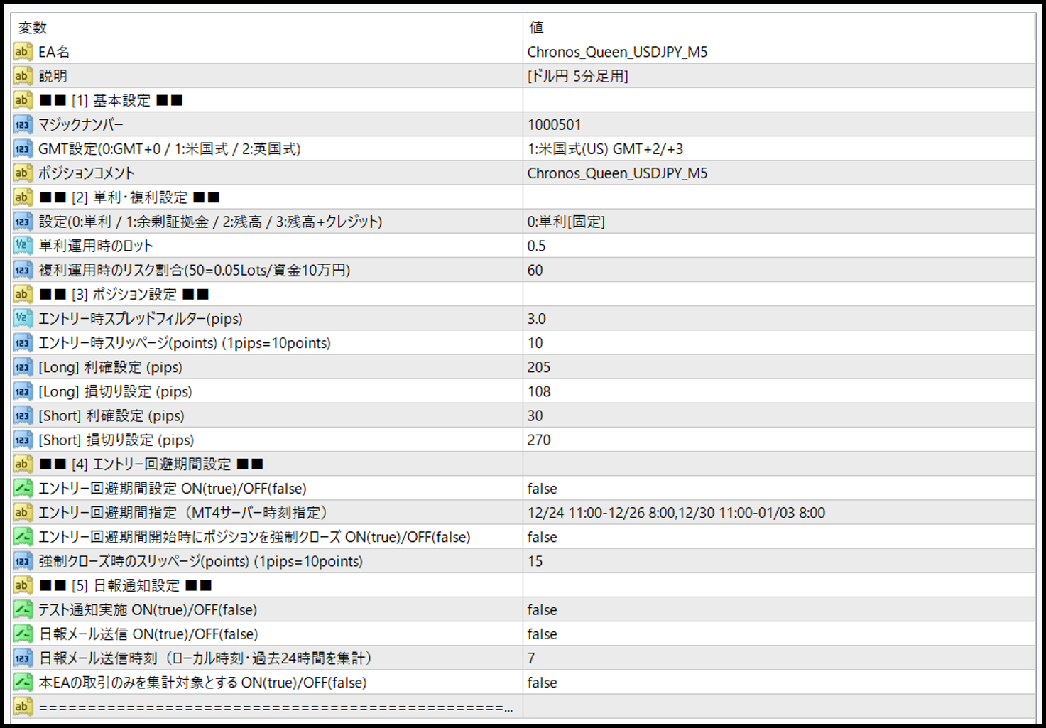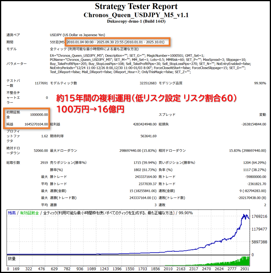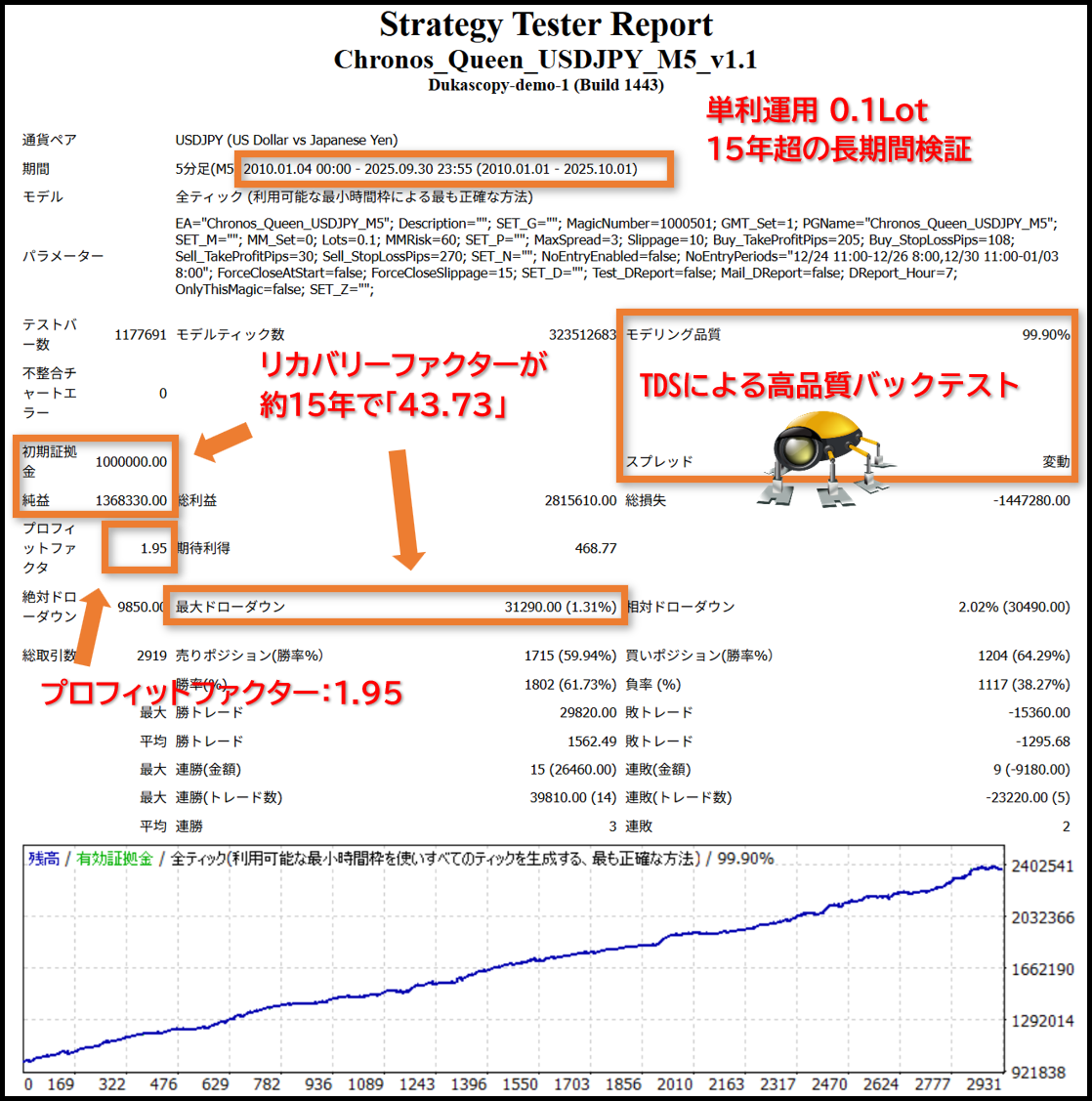 【コンセプト】 Chronos Queen USDJPY(クロノス・クイーンUSDJPY)は、ゴトー日ロジックをメインとして、東京時間の複数のアノマリーを採用し、USDJPYペア特有の統計的優位性を最大限に活用するEA(自動売買ツール)です。 USDJPYペア特有の時間帯別優位性と独自開発の統計フィルターで高リスク相場を事前に回避し、統計的に優位なエントリーポイントを特定します。 安定のUSDJPYの5分足に特化した最適化を施したEAで、2010年から2025年までの約15年9ヶ月間のバックテストで、リカバリーファクター「43.73」の好成績を達成しています。 また、バックテストで15年連続毎年利益を出せる設計を実現しており、これは15年以上の様々な相場サイクル(リーマンショック後、アベノミクス、コロナショック、急激な円安・円高局面など)すべてにおいて一貫したパフォーマンスを発揮できることを意味しています。 最大片側2ポジのポジション戦略で、長期安定性と利益増加率を両立。まさにChronosシリーズの女王として、相場に君臨する戦略を体現しています。