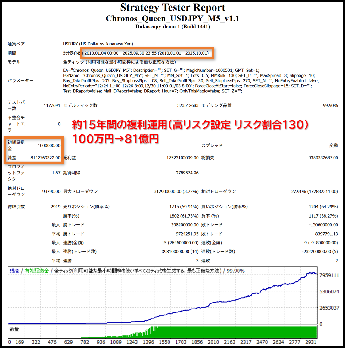 なお、本EAは固定ロット運用でも十分有効に活用可能ですが、複利運用でその真価を発揮します。