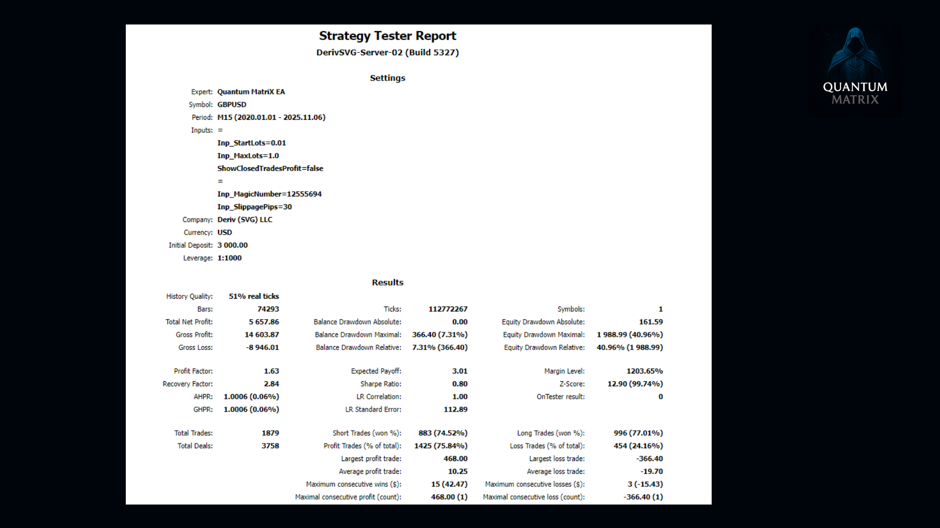 Quantum Matri-X EA は、GBPUSD /(英ポンド/米ドル英ポンド/米ドル)専用に設計された、完全自動化・高性能の取引エンジンです。すべてのコンポーネントは、実行の正確性、リスク管理スケーリング、継続的な取引管理、およびプロフェッショナルグレードのチャートインターフェイス強化のために設計されています。この EA は、滑らかな実行、明確な管理、および不要な複雑さなしに、あらゆる市場条件での自動的な収益性を求めるトレーダーのために作られています。