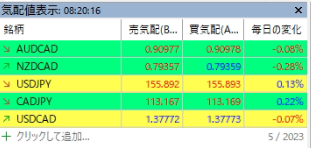 MT5の気配値表示に「AUDCAD,AUDNZD,USDJPY,CADJPY,USDCAD」を追加してください。