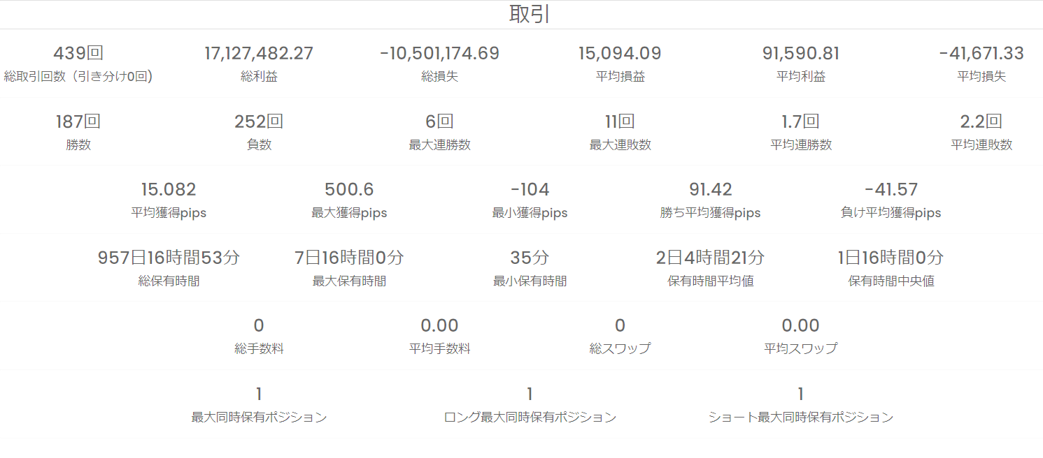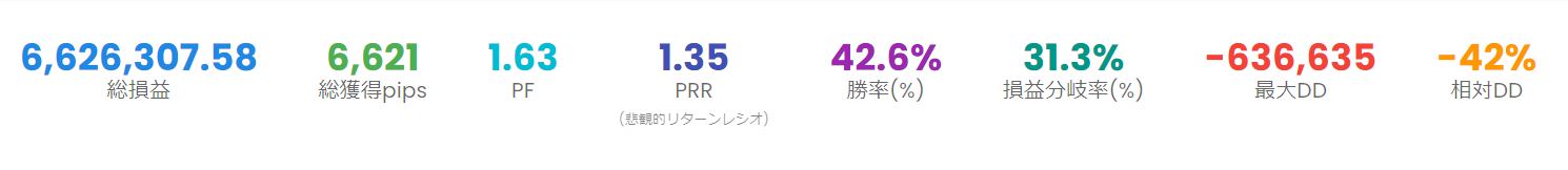 裁量ベースのためリスクリターンを重視し、反転しそうな場面では早めに撤退ているために勝率は50%を切りますが、利益をとれる所はしっかりとりにいきます。