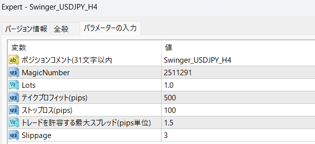 ・SL(Stop Loss):EAの設定上の最大損失pips(または指定された金額など)