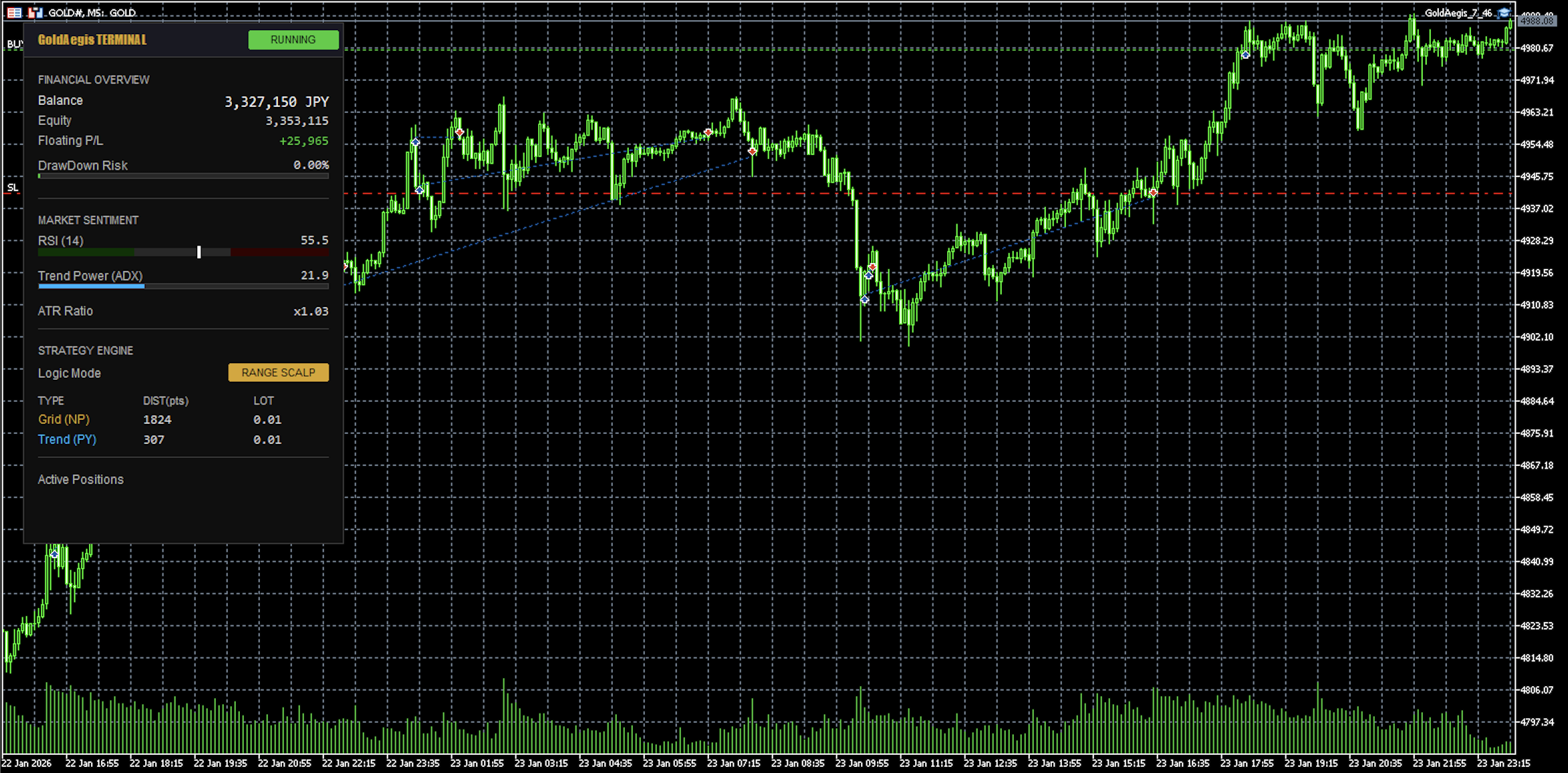 先日のゴールド大暴落の際、他社のナンピンEAはすべて飛びましたが、GoldAegisだけは「シールド機能」が作動してエントリーが止まり、無傷で生還しました。「守りが最強」というキャッチコピーは伊達じゃないと実感しています。