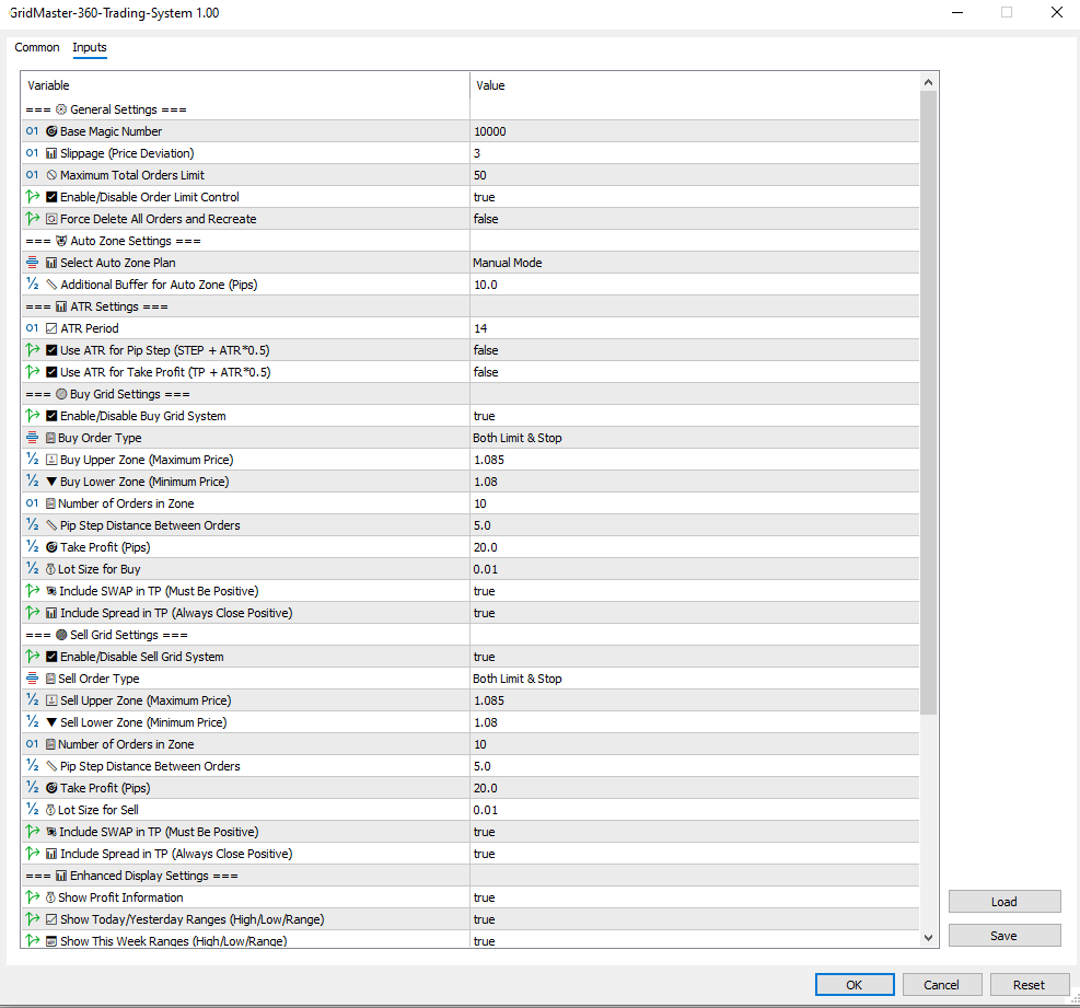 //| 📊 SYSTEM INFORMATION | //|------------------------------------------------------------------| //| 推奨資本: $30,000 (セント口座) | //| 最小ロットサイズ: 0.01 | //| リスクレベル: 中程度 | //| 取引スタイル: 自動ゾーン管理付きグリッド取引 | //| 最適タイムフレーム: 任意 (H1) | //| 最適通貨ペア: EURUSD, GBPUSD, USDJPY, ****XAUUSD | //| | //| 🎯 主要機能 | //|------------------------------------------------------------------| //| ✅ 自動ゾーン検出 (今週 / デイトレードモード) | //| ✅ ATRベースの動的ピップステップ & 利益確定 | //| ✅ TPにおけるスワップ & スプレッド補償 | //| ✅ 壊れたゾーンのギャップ埋めシステム | //| ✅ リアルタイム利益 & 統計表示 | //| ✅ 緊急停止 & リセット操作 | //| ✅ 複数タイムフレームのレンジ分析 | //| | //| ⚠️ リスク警告 | //|------------------------------------------------------------------| //| グリッド取引は強いトレンド時に損失が蓄積する可能性のある複数ポジションを含む。 | //| 適切な資本管理を常に使用し、払える額以上のリスクを取らない。 |***実際のフォーワードテスト withアカウントタイプ:DollarCent https://www.myfxbook.com/portfolio/gridmaster360/11834735 オンチャート取引パネルとリアルタイム制御を備えたエキスパートアドバイザー(EA): エキスパートアドバイザー入力パラメータ: