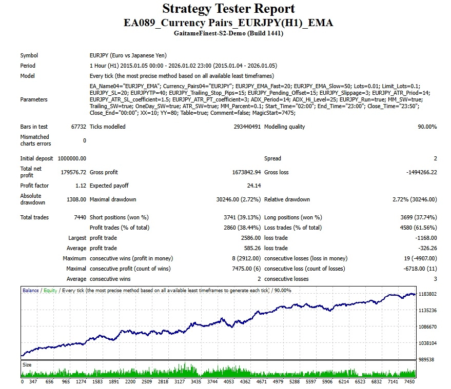 本EAは、短期と長期の2本のEMA(指数平滑移動平均線)のゴールデンクロス・デッドクロスを基本ロジックとした自動売買ソフトです 。EURJPYの1時間足での運用に最適化されており、トレンドの発生を捉えて利益を狙います。