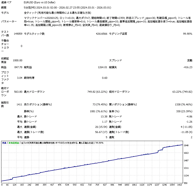 ゴールド系EAのような強い伸び方というより、EURUSDらしい比較的穏やかな値動きの中で、じっくり積み上げていくタイプのEAです。