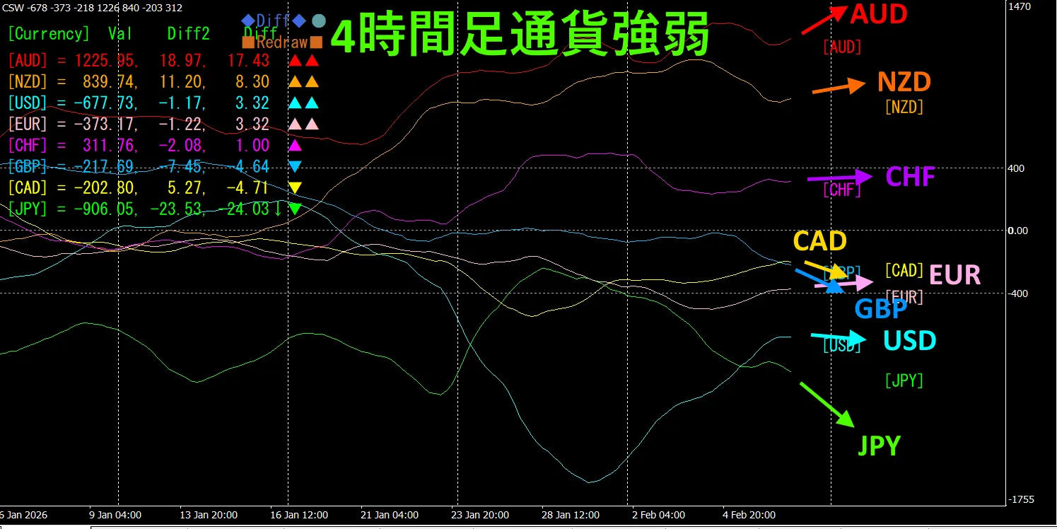 ในกราฟเวลา 4 ชั่วโมง、AUD、NZD、USD、EUR、CHFขยับขึ้น、JPY、CAD、GBPขยับลง