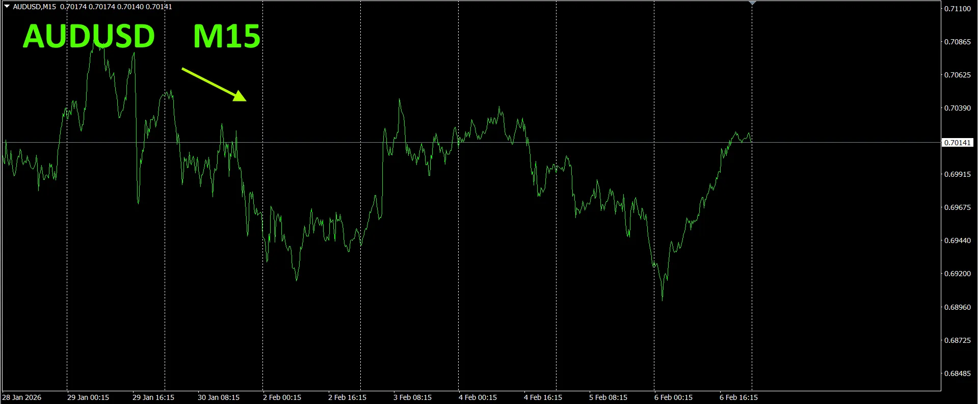 กราฟด้านบนคือ、AUDUSDกราฟ 15นาทีแสดง