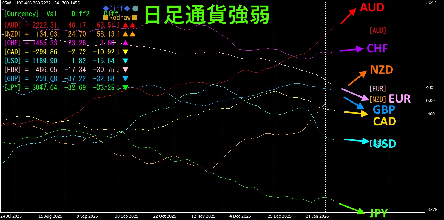 AUD、NZD、CHFกำลังขยับขึ้น。JPY、GBP、EUR、USD、CADกำลังขยับลง。ในกราฟรายวัน、JPYขาลง、AUDที่การพุ่งขึ้นอย่างมากที่เห็นได้ชัด。