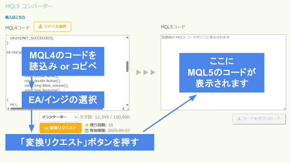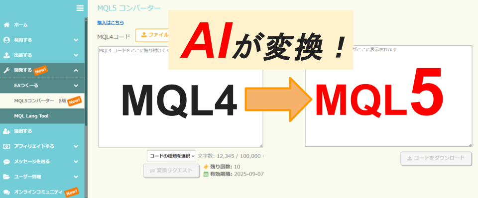 - マイページ内「開発する > MQL5コンバーター」を開く