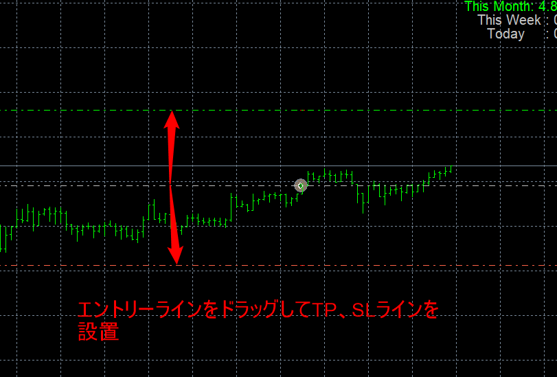 • ラインで TP/SL:ポジション上のラインを TP/SL 方向へドラッグして設置。作成後もドラッグで移動可能。