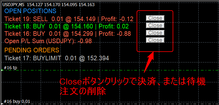 • クローズ/取消:左上の Close ボタンでポジション/待機注文を削除。待機注文は価格ラベル付近の × で即キャンセル。