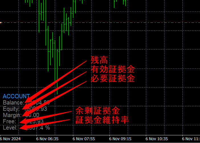 • Balance / Equity / Margin / Free / Level% を常時表示。