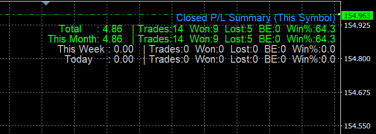 • 合計/今月/今週/本日 ごとに P/L、件数(Trades)、勝ち(Won)、負け(Lost)、引き分け(BE)、勝率(Win%)。