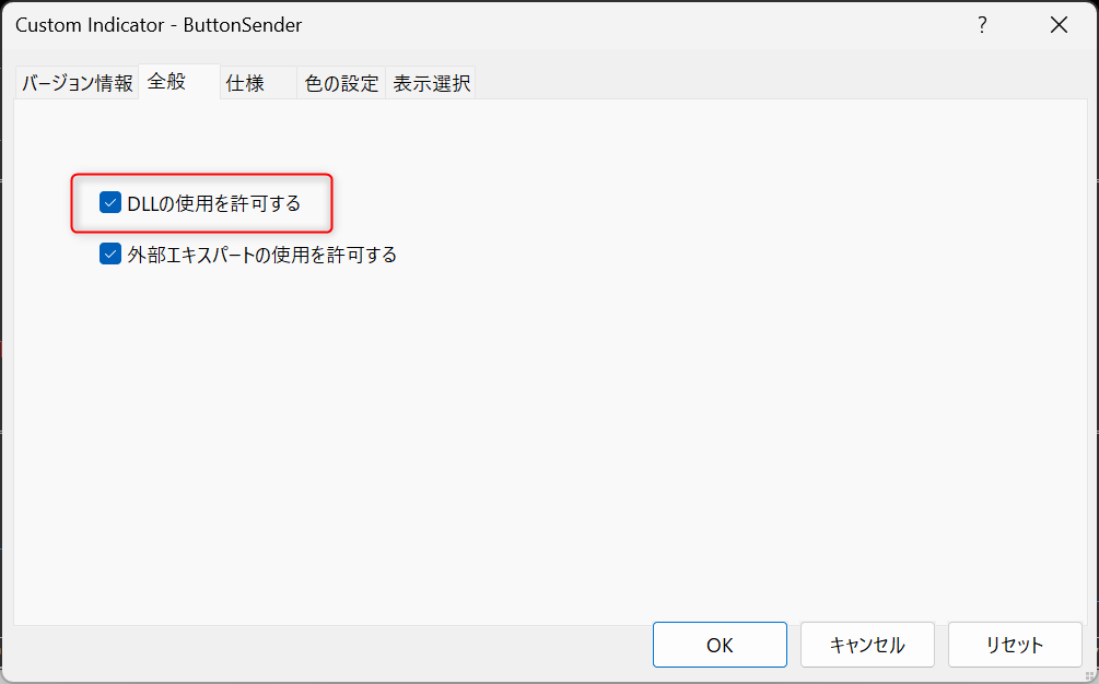 2. インジケーターの DLL を許可:インジケーターのプロパティ 「仕様」 タブで 「DLL の使用を許可する」 にチェック。