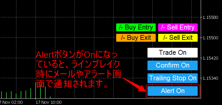 エントリーライン/決済ラインのブレイクをアラート or メール通知 でお知らせします。