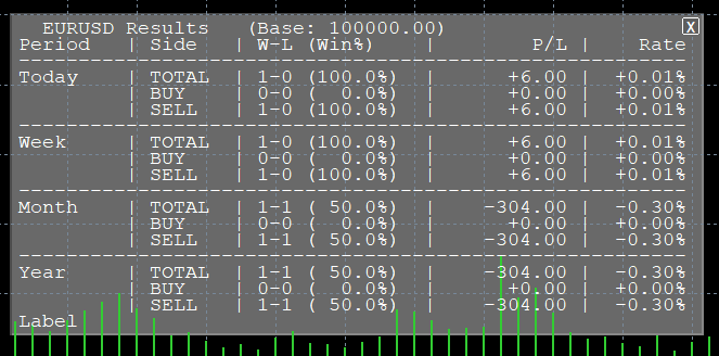 成績パネルはチャート左下に表示されます。