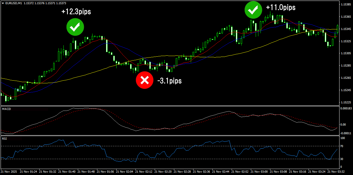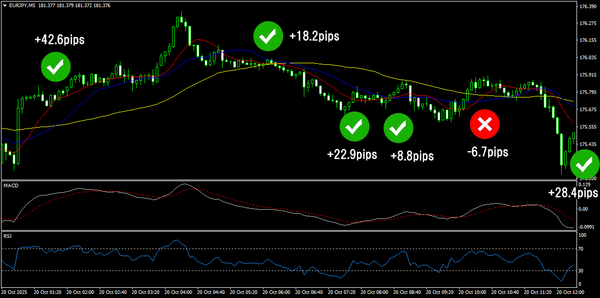 ルールもとてもシンプルで、使うのはローソク足、3つの移動平均線、MACD、RSIです。