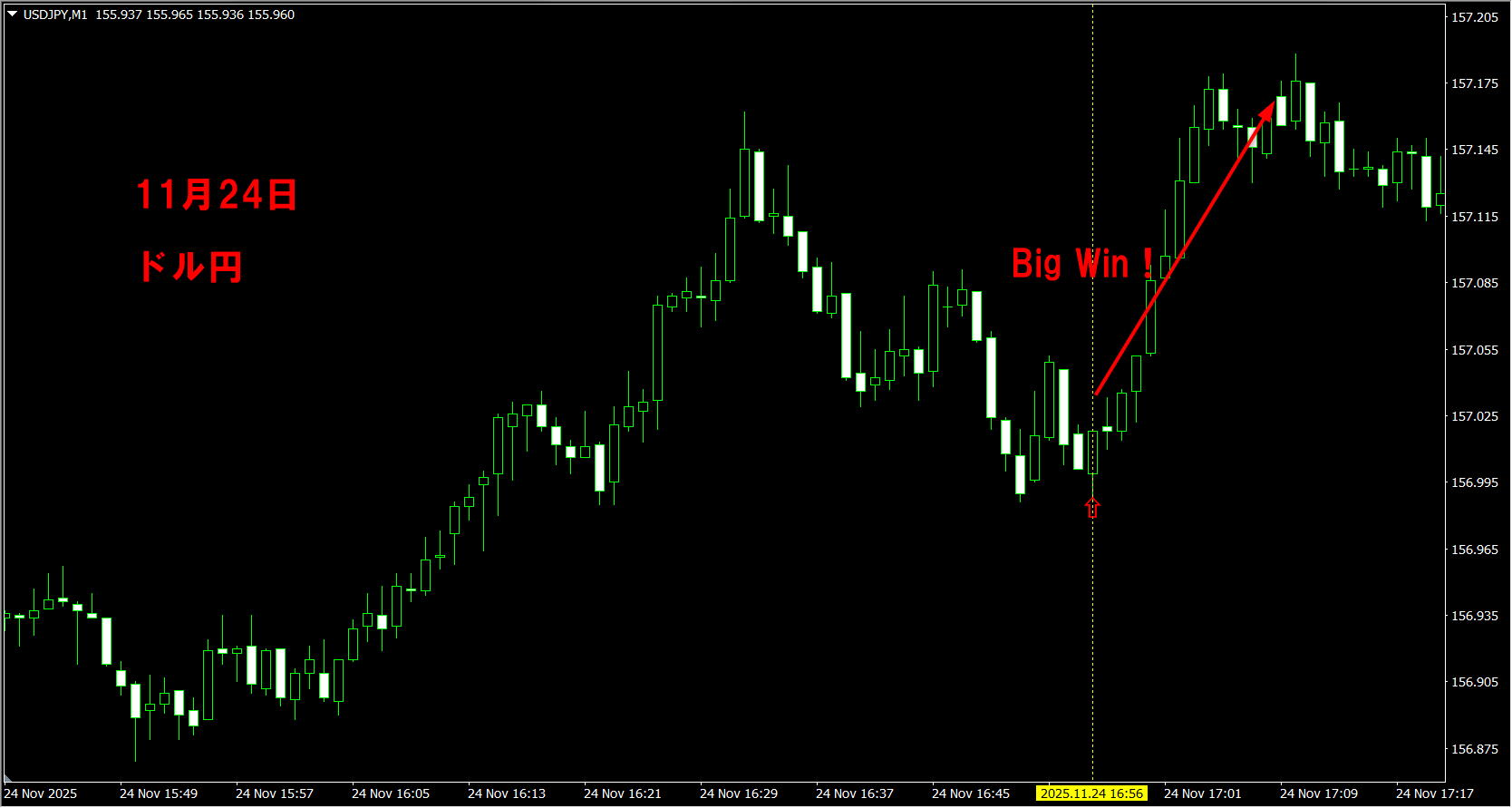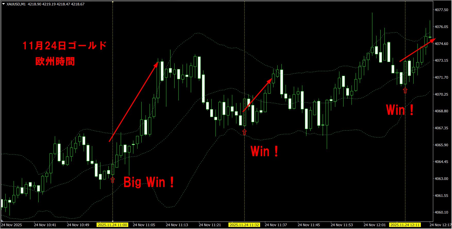 これはゴールドの11月2日の1分足スキャルのトレードです。 王道的な押し目買いになっているように見えるかと思いますが、最近流行のゴールドに特化した商品やロジックでこれと同じエントリーをすることは非常に難しいことをご存じでしょうか? その理由については後ほど説明します。 次に、同じ日のFX、ドル円、ユーロドル、ポンド円のトレードをご覧に入れましょう。