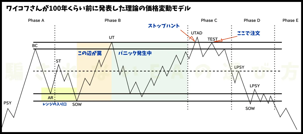 2つ目の手法(ワイコフ)はSMC(スマートマネーコンセプト)のエントリーポイントを、ワイコフ理論の視点から見つける方法です。ローソクと出来高のみで分析します。