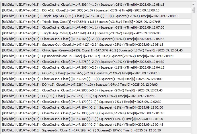 ( バンドウォーク・スクイーズ・三重天底・σ値・ローソク足確定カウントダウンなどを一覧で確認出来るため、トレードする通貨ペア・狙う場所・取引時間などを決めることが出来ます。 )