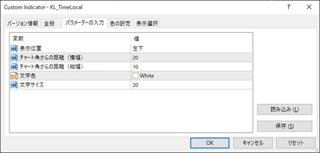チャート上に現在時刻(PC端末のローカル時刻)を表示するシンプルなMT4用インディケータです。