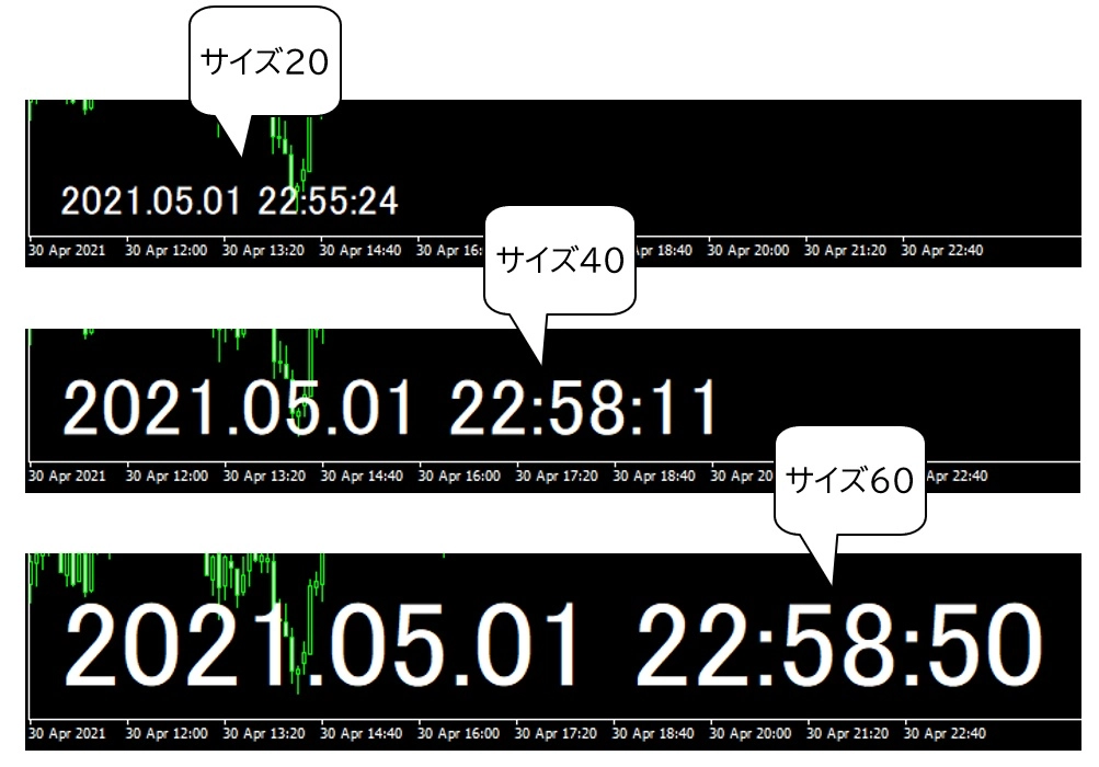 大画面、マルチディスプレイでトレードしていると、文字が小さ過ぎて見えづらく困ることがあります。 このインディケータは、文字の大きさ、表示位置を自由自在に変えられるため、ディスプレイの設置場所に合わせて、見やすい位置に表示させることが可能です。