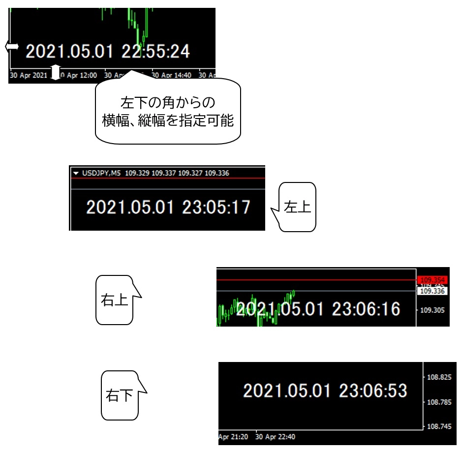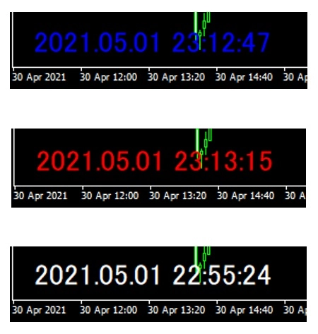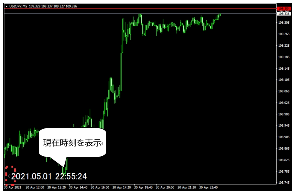 チャート上に現在時刻(PC端末のローカル時刻)を表示するシンプルなインディケータです。