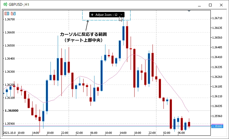 ※「カーソルをチャート上部中央に移動させると現在のズーム値を表示する」「ズーム値をテキストで表示する」「多段階ズームボタンを表示する(キーが無効になります)」 をすべて true にすると表示されます。