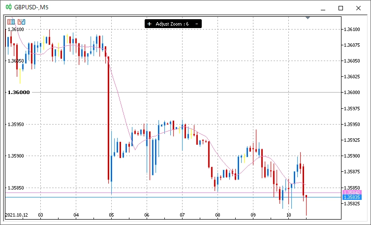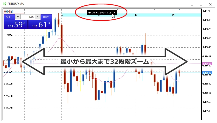 MT4 / 5のズームは 1 ⇔ 2 ⇔ 4 ⇔ 8 ⇔ 16 ⇔ 32 の6段階しかなく粗めですが、この MT4 / 5 内部に持つ 1〜32 段階のズーム幅を1段階ずつズームできるようにしました。